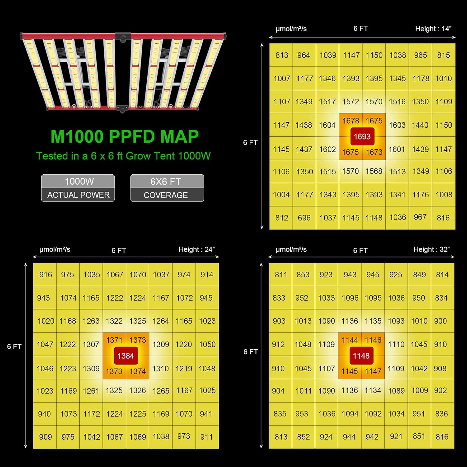 - Maximiza los rendimientos y la calidad de los cultivos: la luz led para cultivo de plantas AGLEX M1000 tiene 3,400 chips de alta eficiencia, solo consume 1,000 W con 3,400 led, logrando una densidad de flujo de fotones fotosintéticos (PPFD) promedio más alto con 1,693 muol/㎡/s a una cobertura de núcleo de 6 x 6 pies. El rendimiento medio es de más de 2.8 g (0.10 onzas) por vataje. La barra de luz led de 1,000 W puede ayudarte a lograr la máxima calidad y cantidad. Amplio voltaje de entrada 100-277 V, puede satisfacer la mayoría de voltajes de entrada.